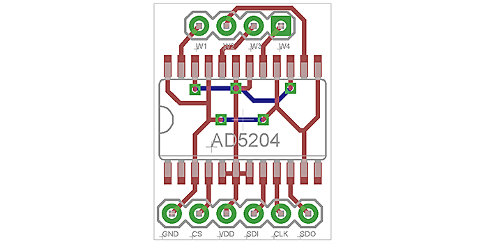 I was working on a project where I needed to use some of those AD5204, so I developed a tiny breakout board in order to be able to prototype it using a SMD chip on the breadboard.