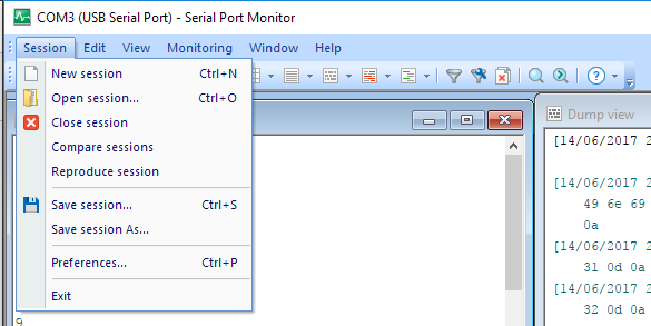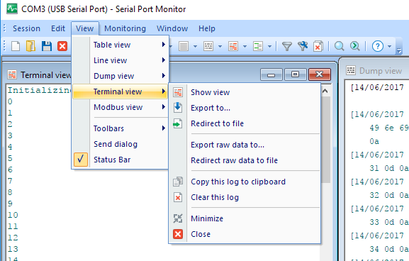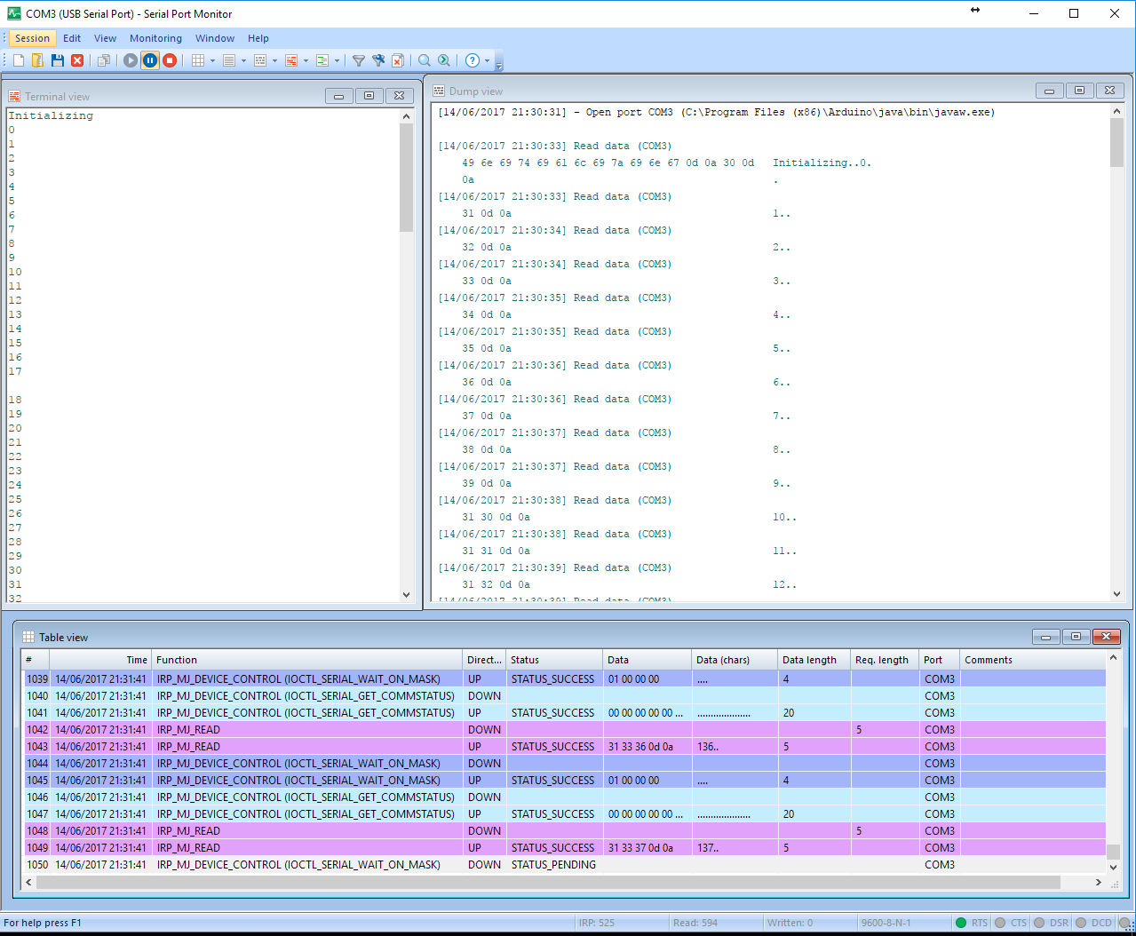 On the image bellow, you can check the windows that I am currently using: “Terminal View”, showing exactly what is coming from the Serial Port. “Dump View” that shows timestamp, the hex data and the message, and the “Table View”, showing the captured data from the developer’s point of view: it presents the table consisting of the recorded IRPs. Each row represents one IRP and each column represents one single part of IRP. It is interesting to point that the Serial Port Monitor doesn’t block the serial port while in use, meaning that another software can be “blocking” the port and you can still analyze all the data.