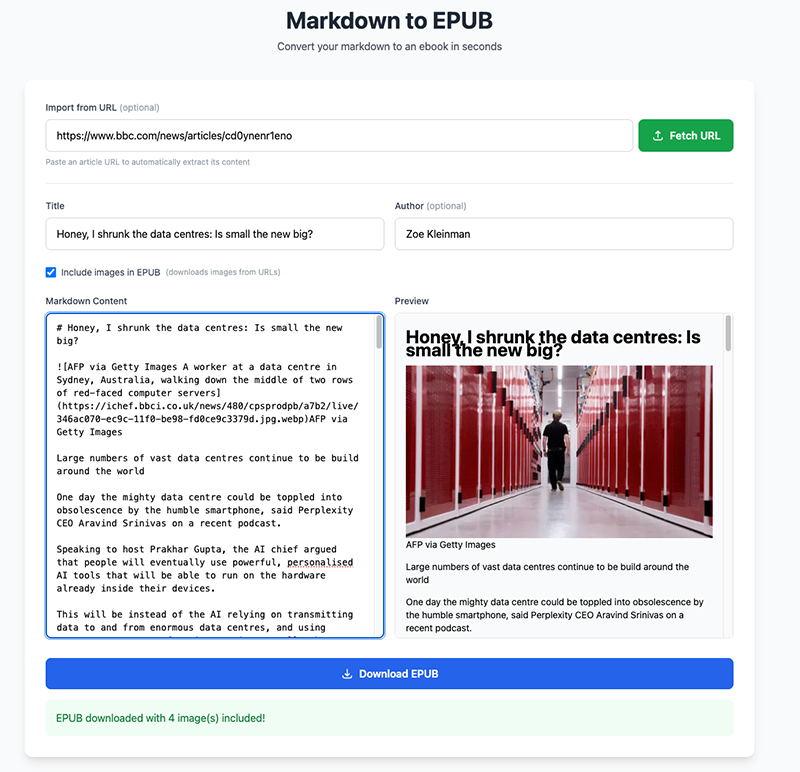 Besides books, I have so many articles saved to read, and when I am at the computer getting work done, I usually forget to check them out (can you relate?). So with that problem in mind, I decided to create a very simple markdown to epub converted where you can simply paste a markdown text or enter an URL, and the backend takes care of downloading the files and converting what metters. It even processes the images :)
