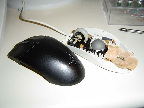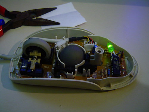 Surfing on http://metku.net I found an interesting tutorial on how to mode one old mouse by installing an LED on it. I had this old mouse hanging around so I decided to try it myself.