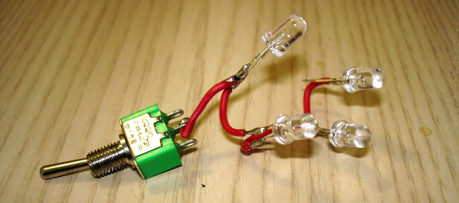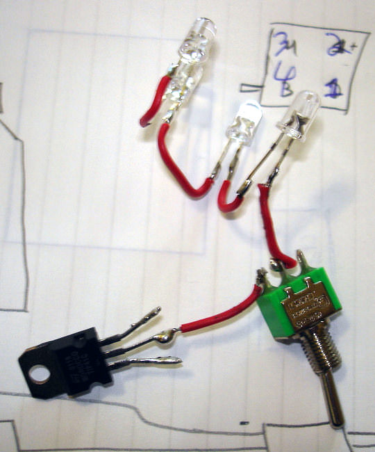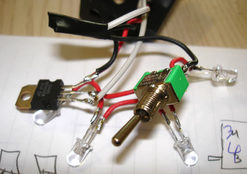 After connecting all of the LEDs, you must connect the cable coming from the LEDs to the center pin of the switch. One side of the switch goes to the middle pin of the TIP31 component, and the other one goes to the ground cable.